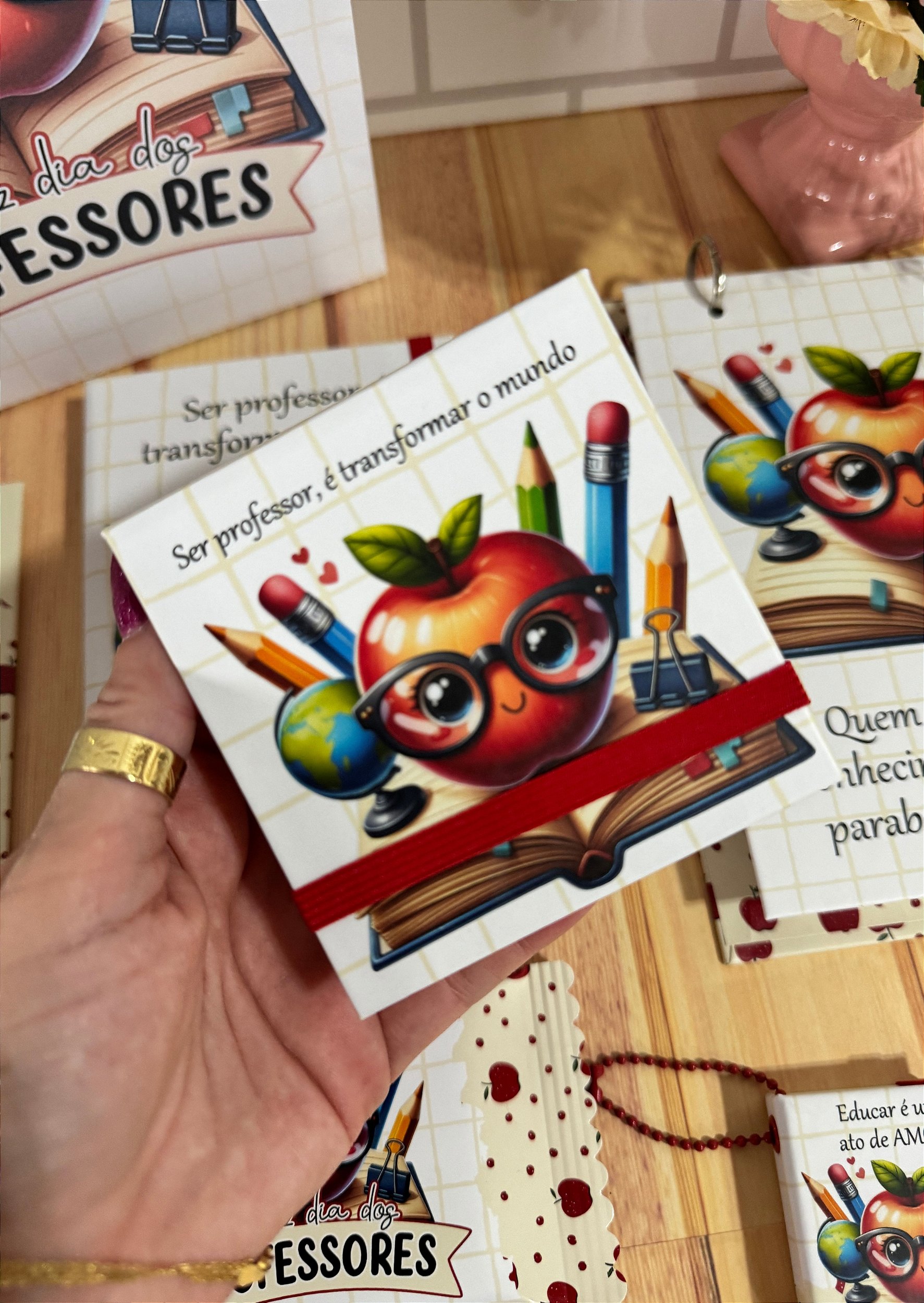 Bloco autoadesivo com capa dura, fechamento com elástico.