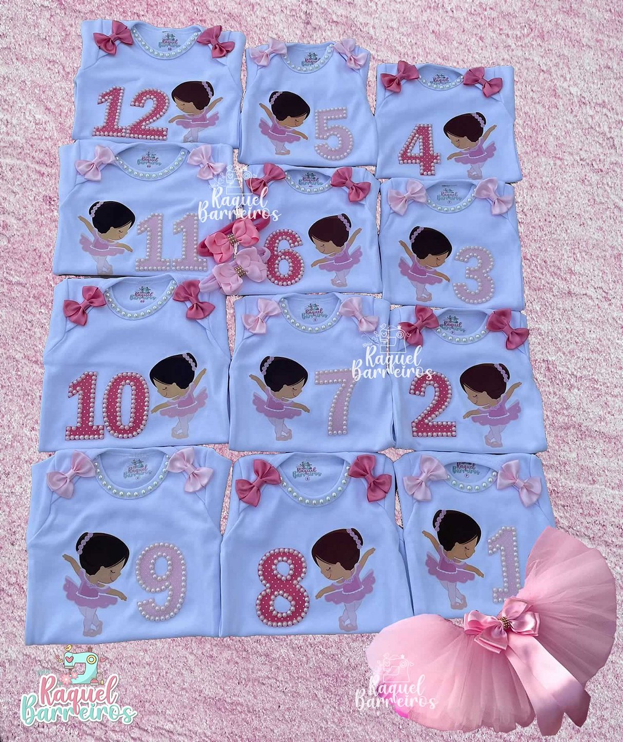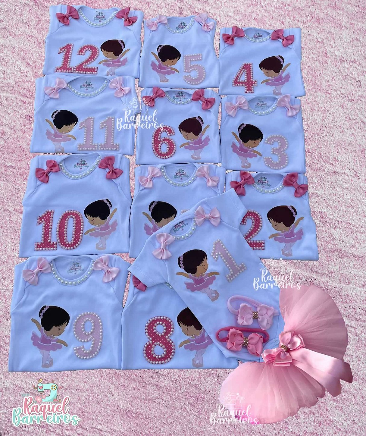 12 bodies personalizados 100% algodão, um para cada mês, com números bordados, aplicação de pérolas e estampa de bailarina.