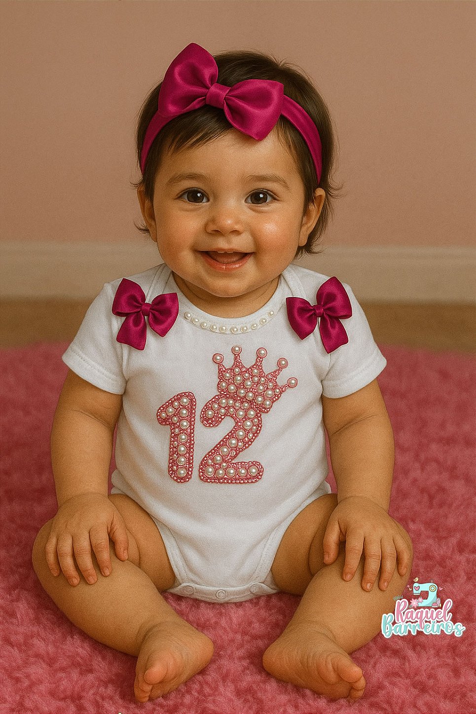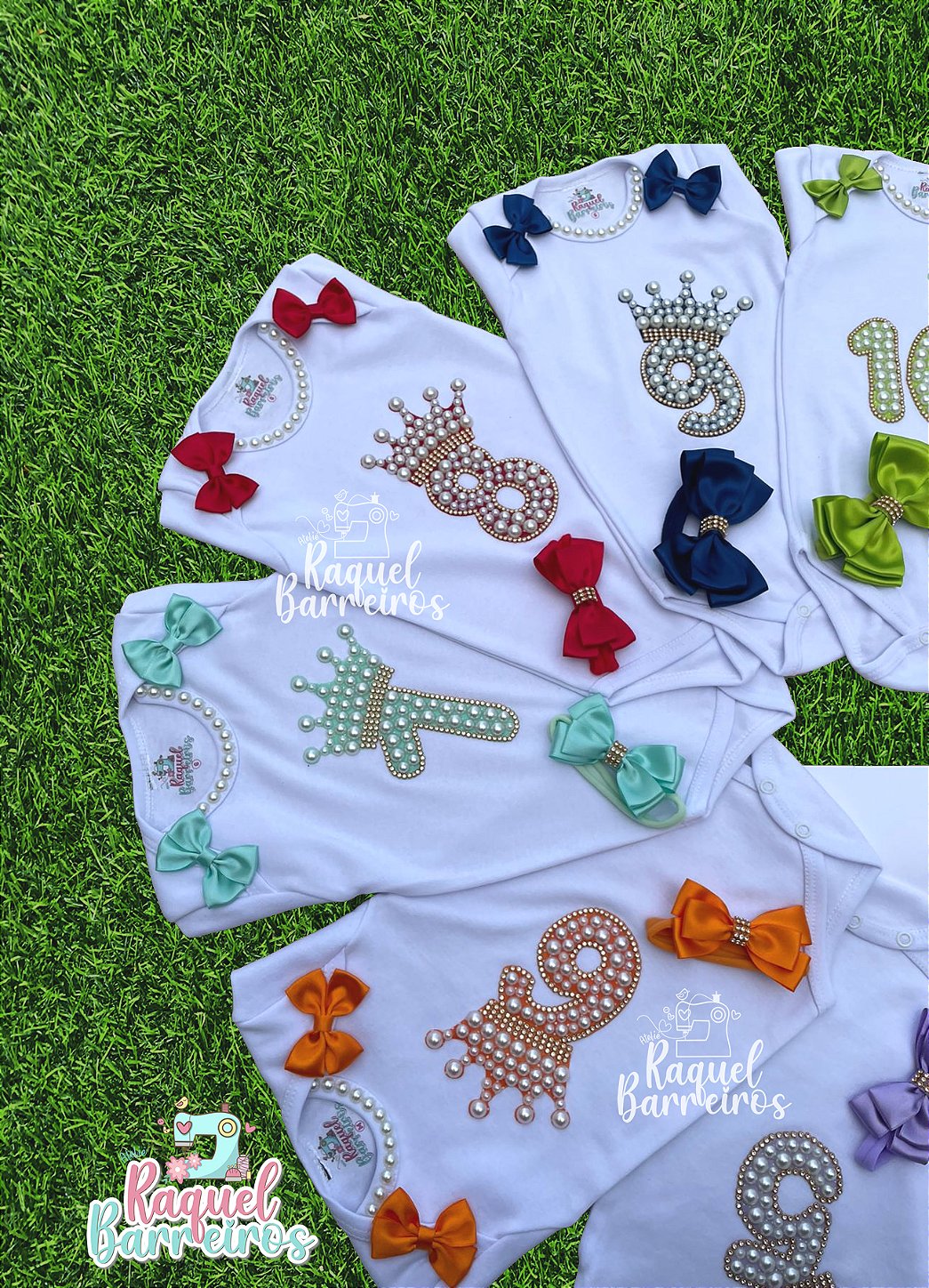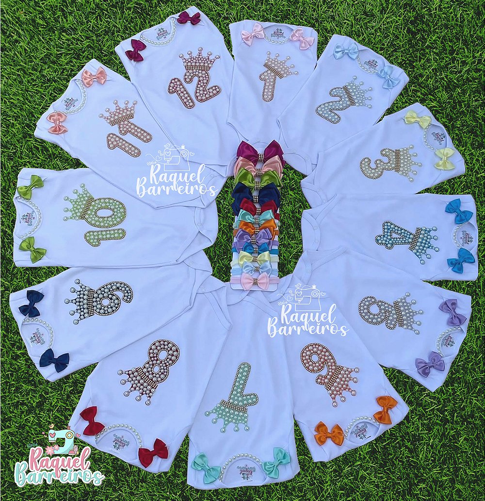 Cada body representa um mês, do 1 ao 12, e acompanha uma aplicação artesanal de coroa e número com pérolas e strass de alta durabilidade e brilho.