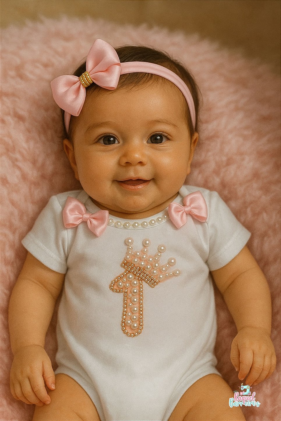 Design Exclusivo: Cada body possui número e coroa luxuosa com laços coloridos fixos combinando e pedraria na gola, sem afetar a abertura do body.